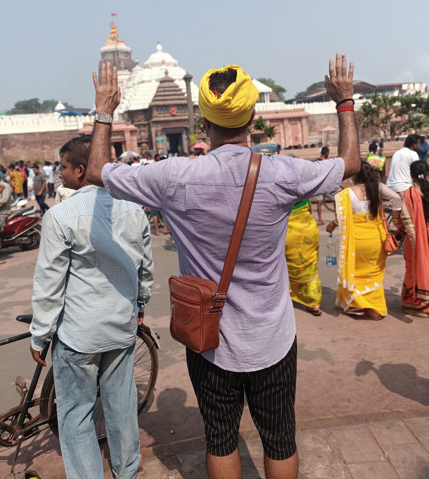 My accommodation was conveniently located near both the temple and the beach, just 3 kilometres away in a decent hotel. I began my day early at 6 AM for a darshan and was greeted by a massive crowd at one of the temple entrances due to Ekadashi. A kind police officer assisted me in quickly entering the main premises. Inside, many pandits were sharing historical facts about the temple and its services, but I chose to purchase Prasad to offer near the “Pramukh dwar” instead. With the enchanting sound of "Jai Jagannath," the darshan was completed swiftly, allowing me to find a peaceful spot near the temple to sit for a while. Since the temple's bhog, a significant offering is served around 2 PM, I had made arrangements to return in the evening for another visit. Visitors are reminded that phones are prohibited inside the temple, and certain attire is required for entry. I purchased a yellow dhoti to wear in the morning, which is now wrapped around my head.