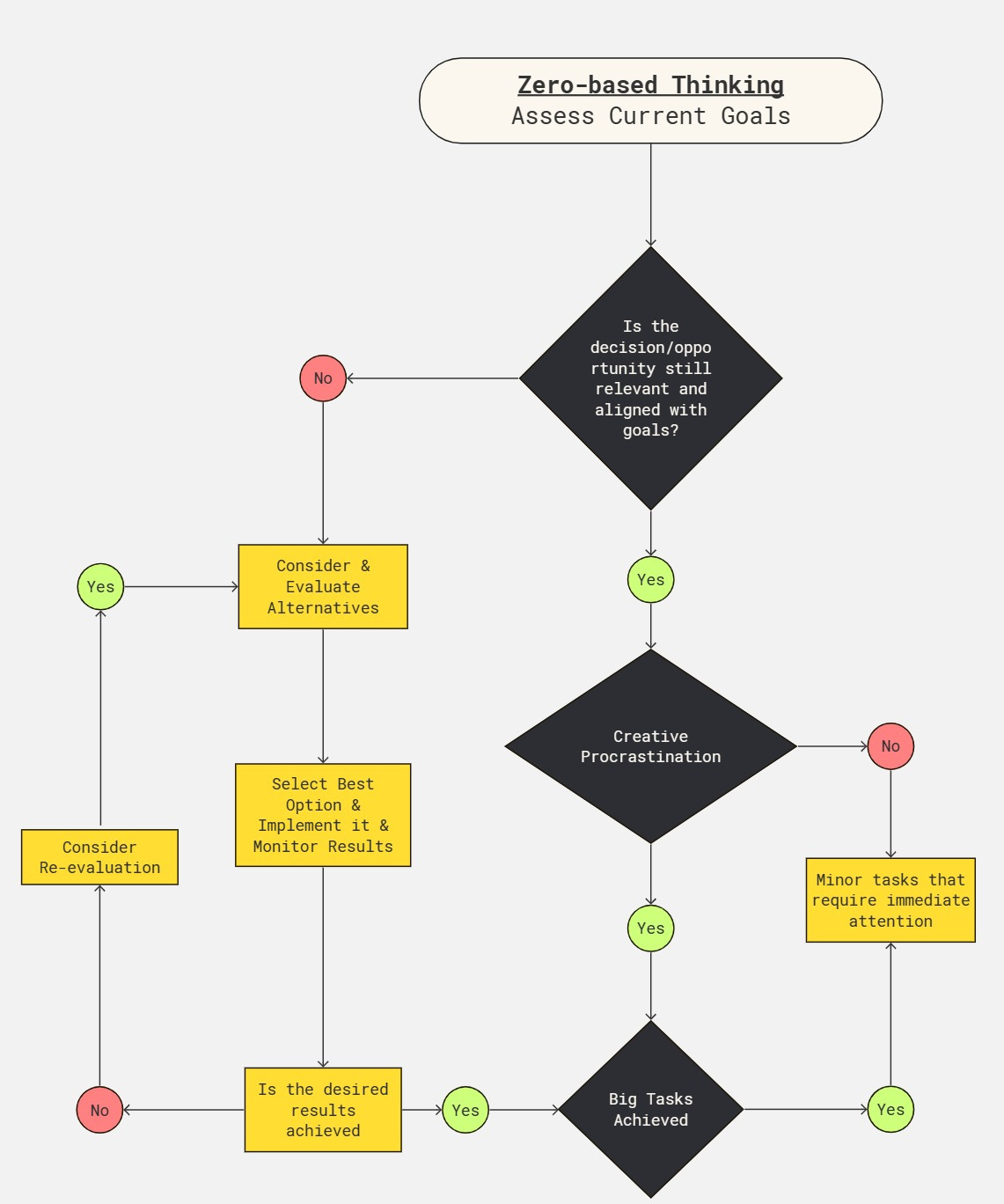 5) Strategic Procrastination: A Productivity PracticeEngage in zero-based thinking (flowchart below) across all aspects of your life. Continually ask yourself, "If I weren't already committed to this, would I start it today?" If not, consider abandoning or creatively procrastinating on it. Evaluate each personal and work activity based on your current priorities. Choose at least one activity to abandon or delay until your critical goals are accomplished.